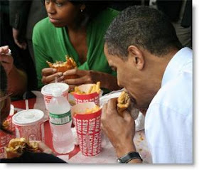 Actually, Obama is making a great sacrifice here. You know he and Moochelle would love to spend the 4th of July kicking back at a barbecue, scarfing down hot dogs and ice cream and drinking sweet, syrupy sodas. But Obama is going through great pains here to re-enact a great scene in American history: He is none other than the re-incarnation of Ben Franklin, and he is re-enacting 'ol Poor Richard's 1776 trip to France, undertaken to raise money to sustain the American Revolution.